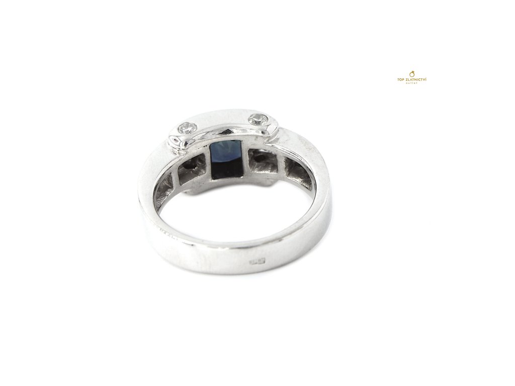 Osazení klenotu: | 4x bezbarvý kulatý briliantový brus-průměr 2.9 mm, 14x bezbarvá obdelníková bageta-rozměr 4.3 x 1.6-2.0mm, 1x modrý kulatý smíšený brus-rozměr 9 x 7 x 4.41 mm |